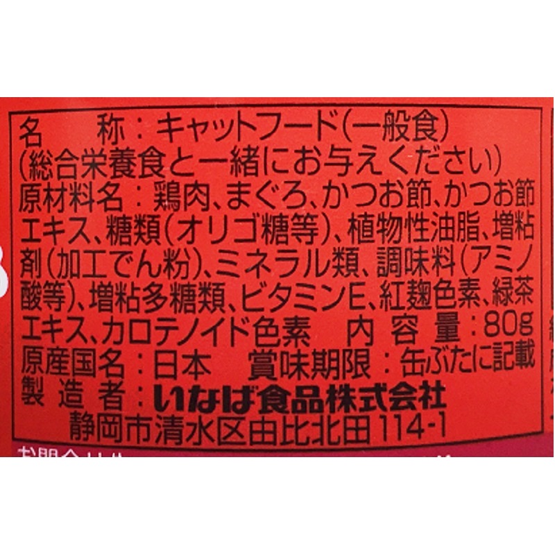 - 鶏肉、まぐろ、かつお節、かつお節エキス、糖類(オリゴ糖等)、植物性油脂、増粘剤(加工でん粉)、