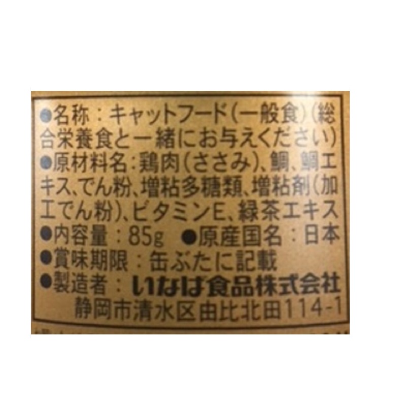 - 鶏肉(ささみ)、鯛、鯛エキス、でん粉、増粘多糖類、増粘剤(加工でん粉)、ビタミンE、緑茶エキス