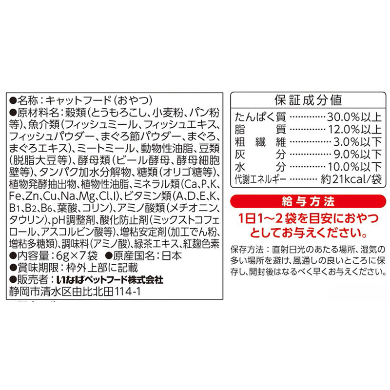 まぐろ節パウダー、まぐろ、まぐろエキス)、ミートミール、動物性油脂、豆類(脱脂大豆等)、酵母類(ビール酵母、