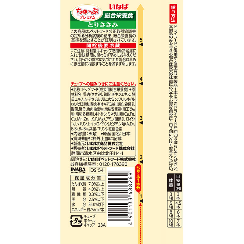 - 鶏肉(ささみ)、鶏脂、チキンエキス、酵母エキス、N-アセチルグルコサミン、クリルオイル