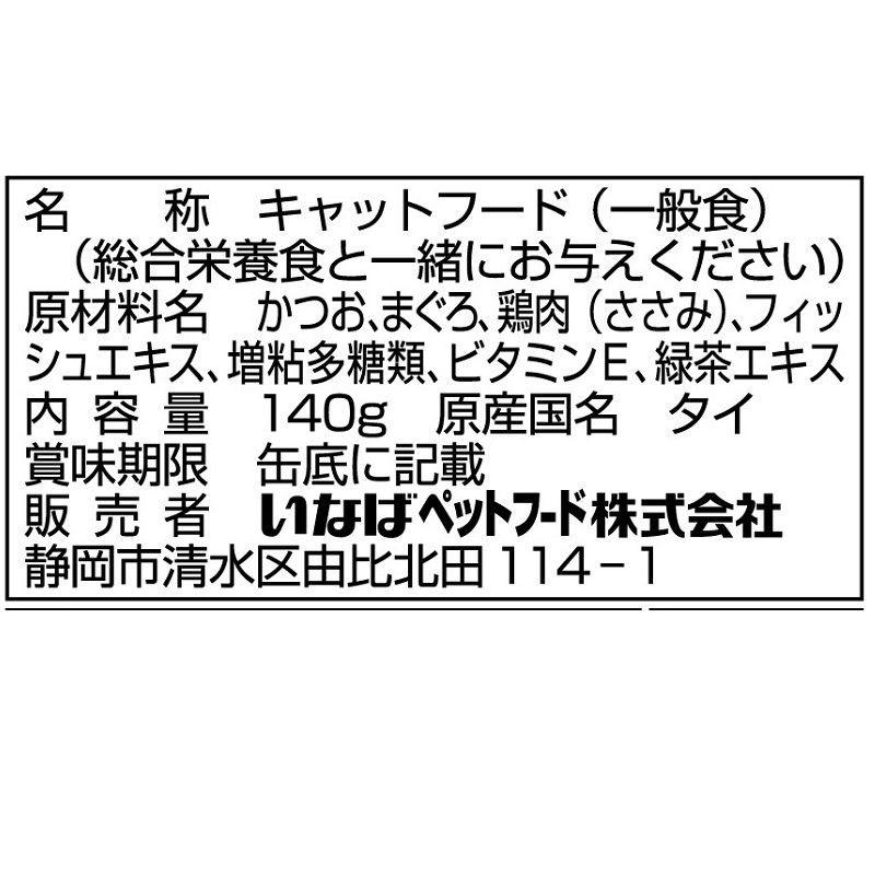 - かつお、まぐろ、鶏肉、フィッシュエキス、増粘多糖類、増粘剤(加工でん粉)、ビタミンE、緑茶エキス
