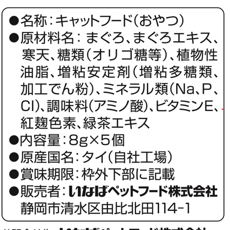 - まぐろ、まぐろエキス、寒天、糖類(オリゴ糖等)、植物性油脂、増粘安定剤(増粘多糖類、加工でん粉)、