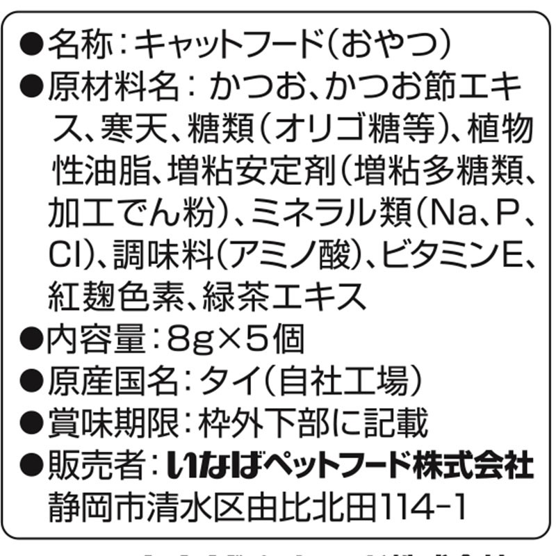 - かつお、かつお節エキス、寒天、糖類(オリゴ糖等)、植物性油脂、増粘安定剤(増粘多糖類、加工でん粉)、