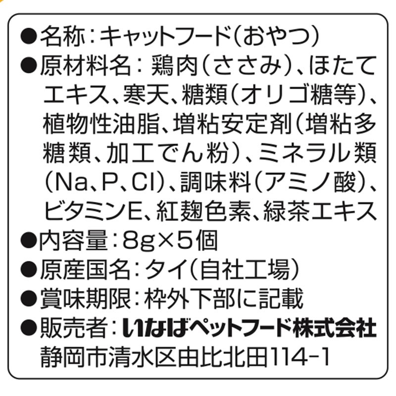 - 鶏肉(ささみ)、ほたてエキス、寒天、糖類(オリゴ糖等)、植物性油脂、増粘安定剤(増粘多糖類、加工でん粉)、