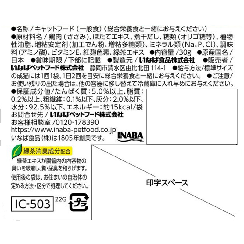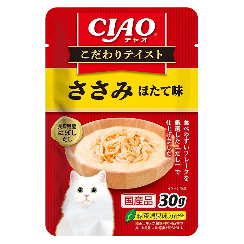- 鶏肉(ささみ)、ほたてエキス、煮干だし、糖類(オリゴ糖等)、植物性油脂、増粘安定剤(加工でん粉、増粘多糖類)、
