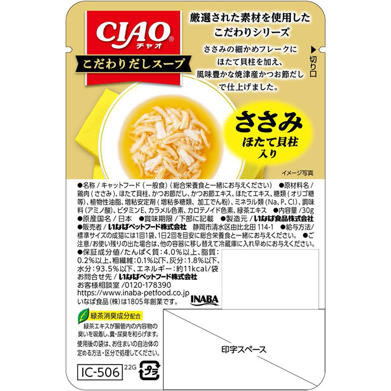 - 鶏肉(ささみ)、ほたて貝柱、かつお節だし、かつお節エキス、ほたてエキス、糖類(オリゴ糖等)、植物性油脂、