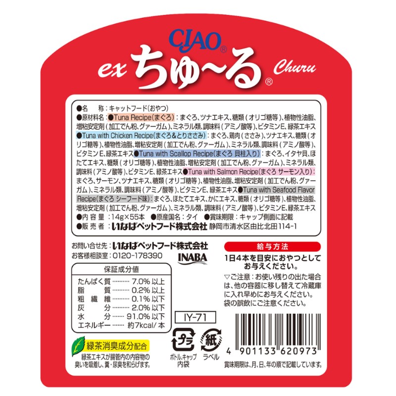 - まぐろ、ツナエキス、糖類(オリゴ糖等)、直物性油脂、増粘剤(加工でん粉)、増粘安定剤(グァーガム)、ミネラル類、