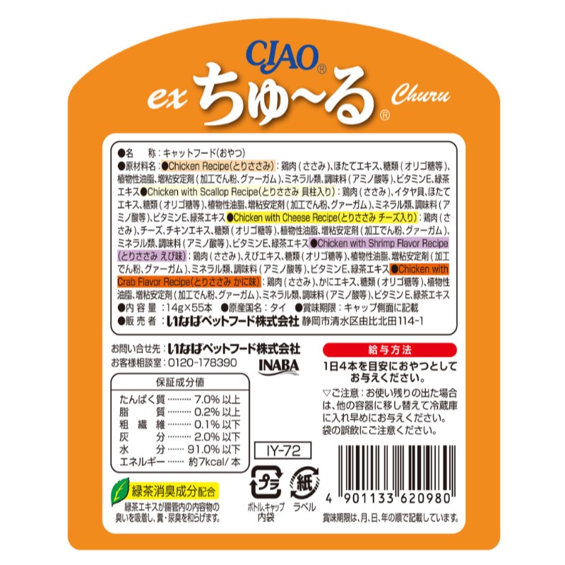 - 鶏肉(ささみ)、ほたてエキス、糖類(オリゴ糖等)、直物性油脂、増粘剤(加工でん粉)、増粘安定剤(グァーガム)、