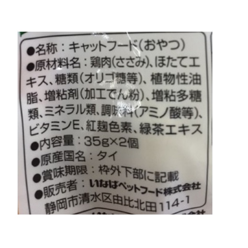 - 鶏肉(ささみ)、ほたてエキス、糖類(オリゴ糖等)、植物性油脂、増粘剤(加工でん粉)、増粘多糖類、ミネラル類、