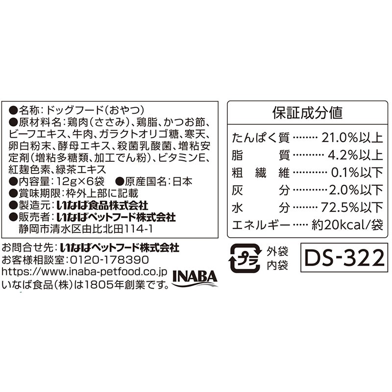 - 鶏肉(ささみ)、鶏脂、かつお節、ビーフエキス、牛肉、ガラクトオリゴ糖、寒天、卵白粉末、酵母エキス、