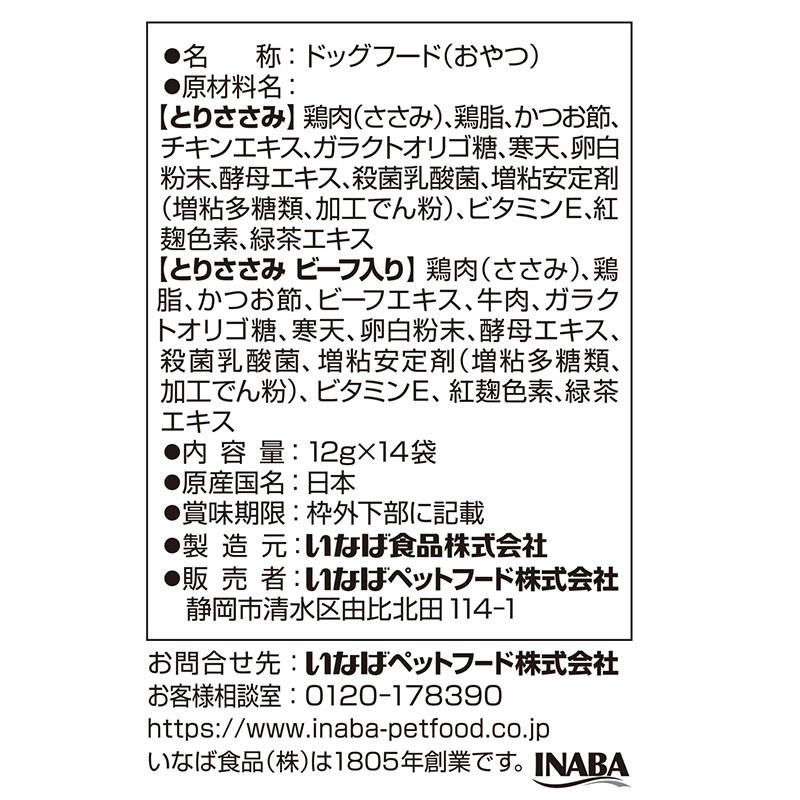 【とりささみ ビーフ入り】鶏肉(ささみ)、鶏脂、かつお節、ビーフエキス、牛肉、ガラクトオリゴ糖、寒天、