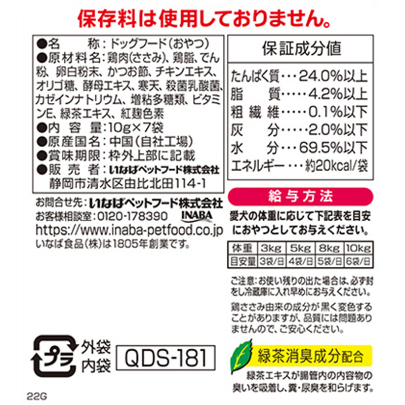 - 鶏肉(ささみ)、鶏脂、でん粉、卵白粉末、かつお節、酵母エキス、寒天、殺菌乳酸菌、カゼインナトリウム、増粘多糖類、
