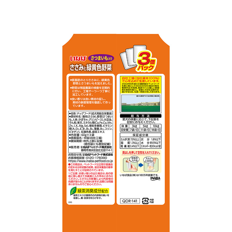- 鶏肉、野菜(さつまいも、人参、かぼちゃ、グリンピース)、大豆油、でん粉、寒天、ミネラル類(Ca、Fe、Cu、Mn、