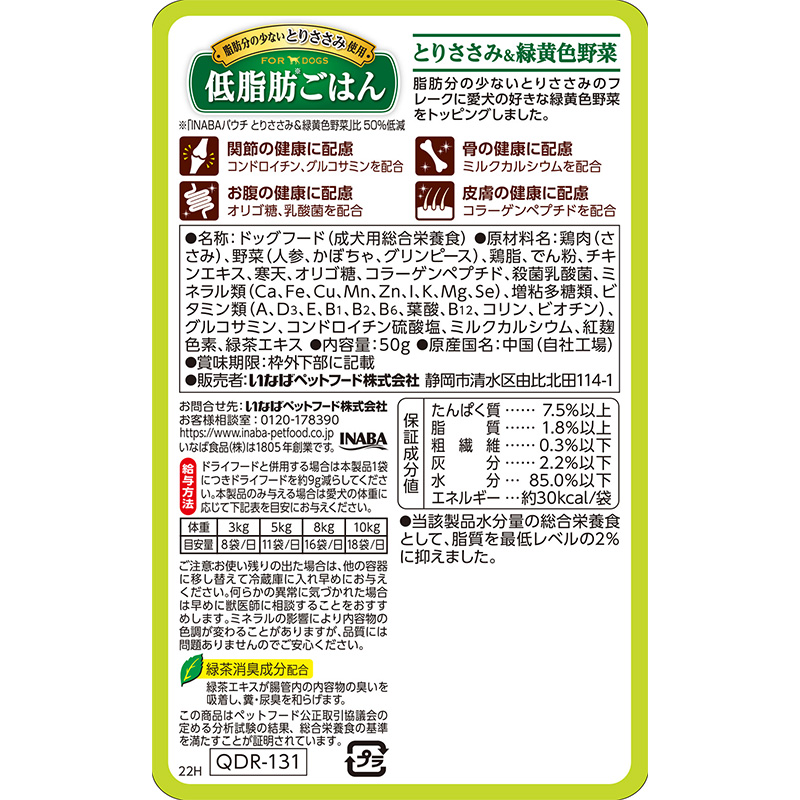- 鶏肉(ささみ)、野菜(人参、かぼちゃ、グリンピース)、鶏脂、でん粉、チキンエキス、寒天、オリゴ糖、