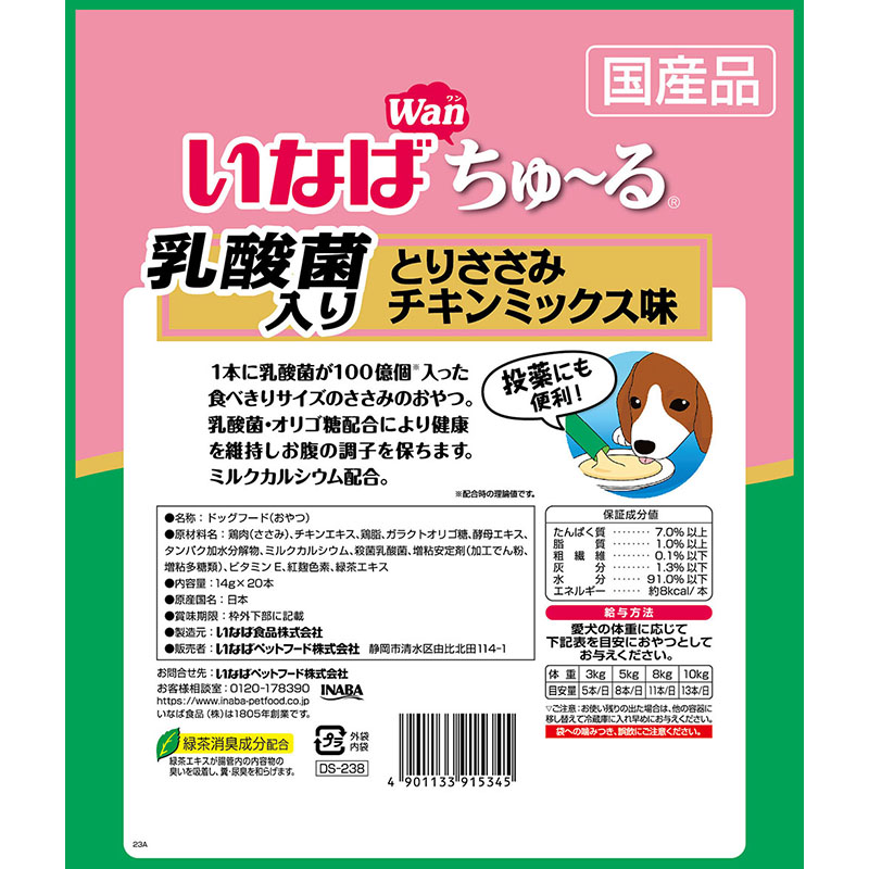 - 鶏肉(ささみ)、チキンエキス、鶏脂、ガラクトオリゴ糖、酵母エキス、タンパク加水分解物、ミルクカルシウム、