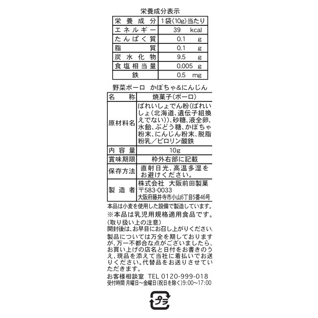 砂糖、液全卵、水飴、ぶどう糖、かぼちゃ粉末、にんじん粉末、脱脂粉乳/ピロリン酸鉄