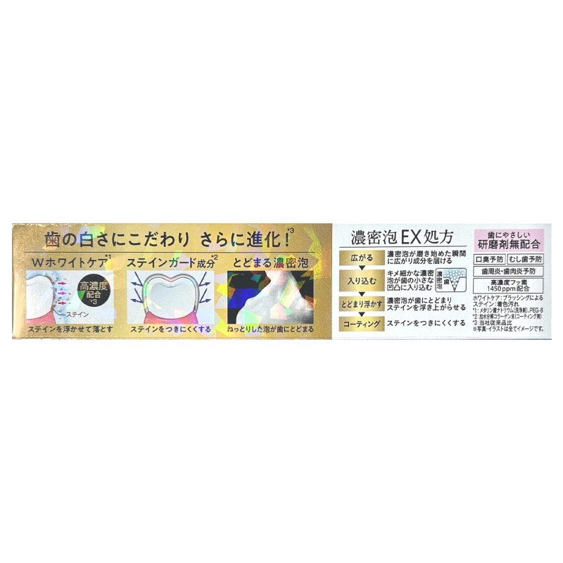 ●Wホワイトケア成分を含むとどまる濃密泡が汚れを浮かせて落とし、ステインガード成分が着色汚れをつきにくくし、美しい白い歯