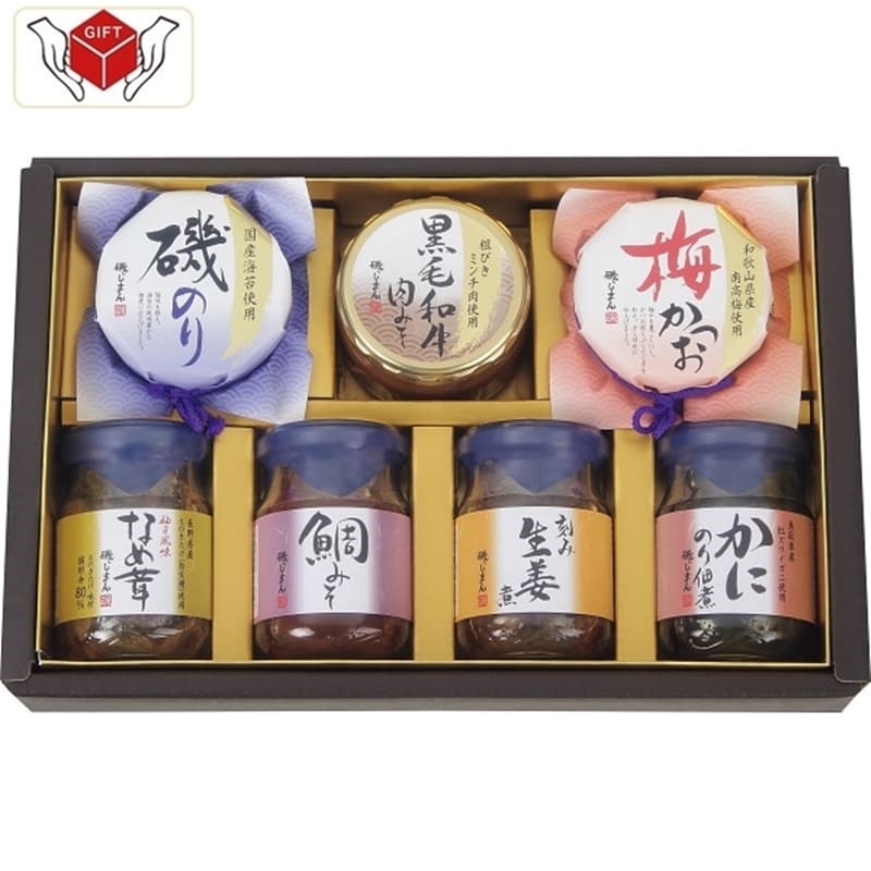磯のり90g・黒毛和牛肉みそ90g・梅かつお90g・柚子風味なめ茸85g・