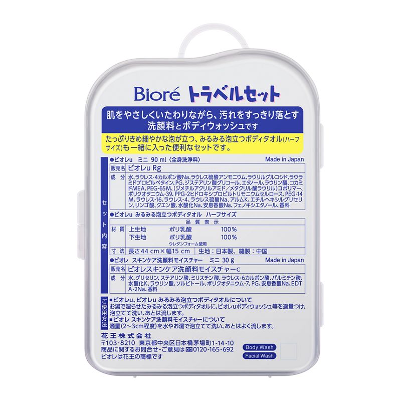 旅行時もコンパクトで便利な、洗顔フォームとボディウォッシュ、ボディタオル(ハーフサイズ)セットです。