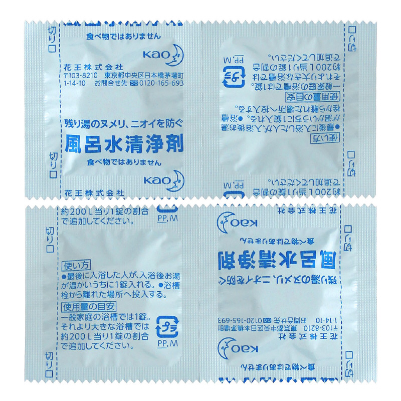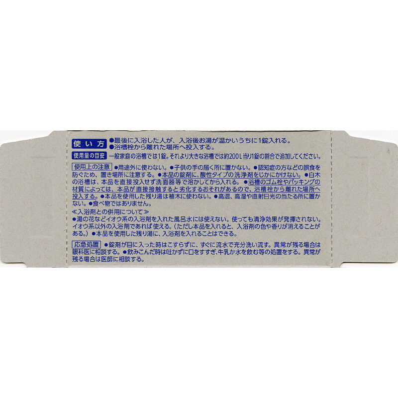 清浄成分配合。入浴後に錠剤を一錠入れるだけで浴槽内の清潔をキープし、沸かし直し時に気になるヌメリとニオイを防ぎます。