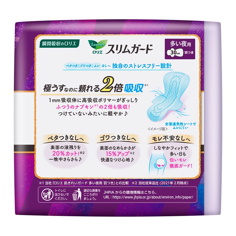 瞬間吸収のロリエ 極うすなのに頼れる2倍吸収※1 ベタつきゴワつきムレなしへ 独自のストレスフリー設計
