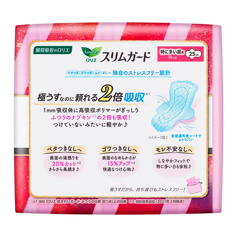 ●無香料(医薬部外品)※1当社「ロリエ肌きれいガードふつうの日用羽つき」との比較※2当社従来品比(2021年2月時点)