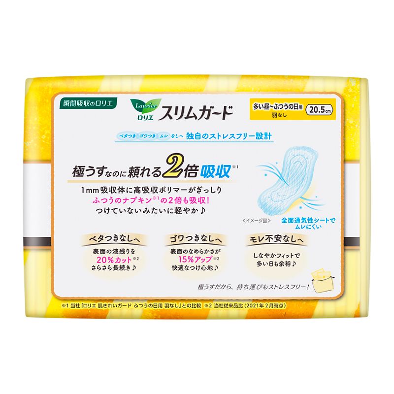 ●無香料(医薬部外品)※1当社「ロリエ肌きれいガードふつうの日用羽つき」との比較※2当社従来品比(2021年2月時点)