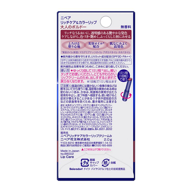 リッチなうるおいに、透明感のある艶やかな発色。ケアしながら、色づき・艶めく、ふっくらした唇にみせる。