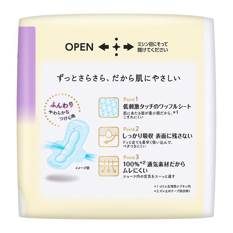 低刺激タッチのワッフルシート。肌にあたる面が最小限だから(ロリエ生理用ナプキン内)、こすれにくい。