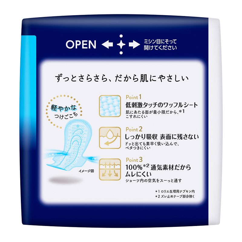 ●低刺激タッチのワッフルシート。肌にあたる面が最小限だから(ロリエ生理用ナプキン内)、こすれにくい。