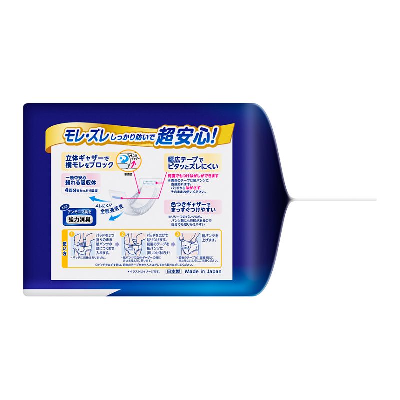 ●ギャザーの青色の目印線で紙パンツにつけやすく、自分でも取りかえやすい。●アンモニア臭を強力消臭。