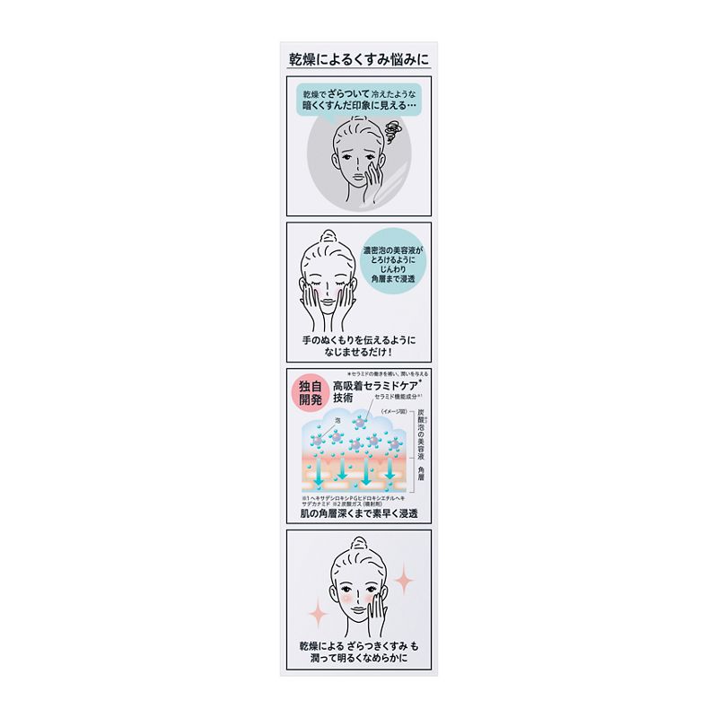 セラミド機能成分※3(保湿)と炭酸※1を含む濃密泡の美容液が、肌の角層深くまで素早く浸透・保水します。