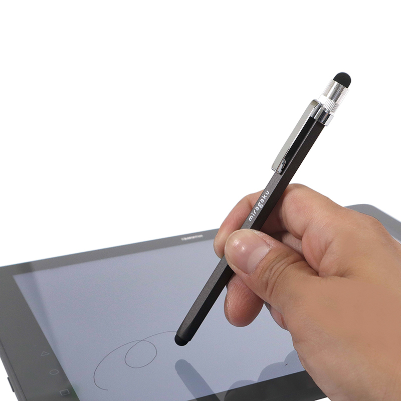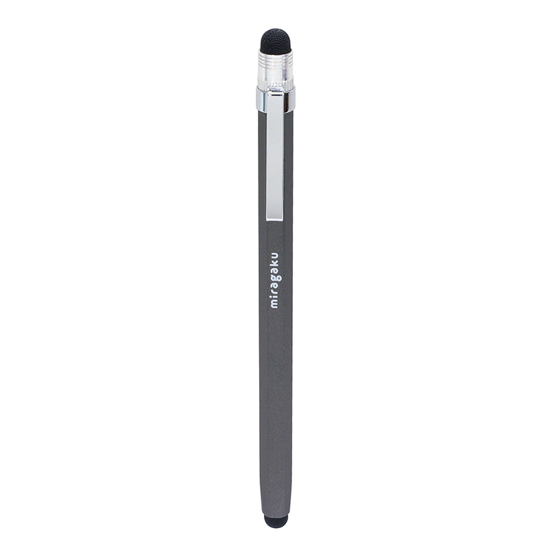 しかっりとしたタッチ(シリコン製)とさらさらタッチ(布製)の2つのペン先で使い分け、六角軸とクリップ付で転がり防止