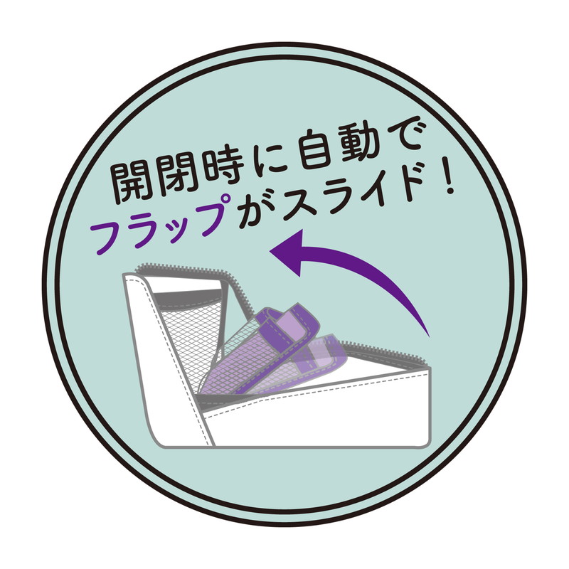 ・開閉時に自動でスライドする小物ポケット付のフラップ