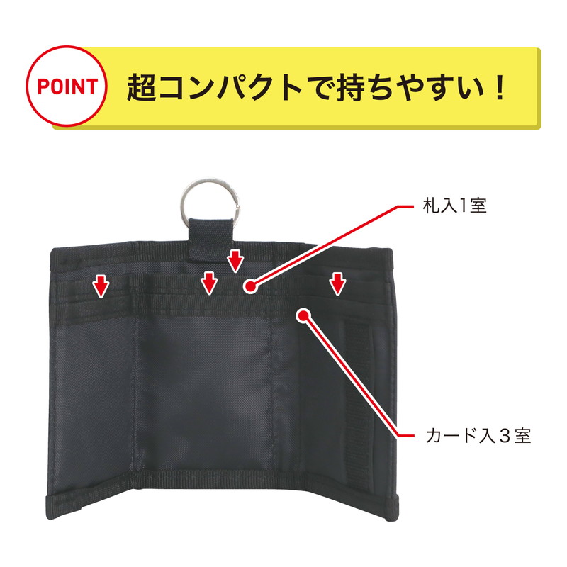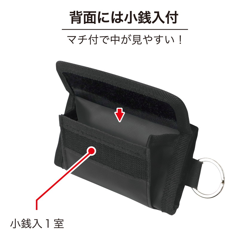 本体生地はマット調のコーティング生地を使用、札1室・小銭入れ1室・カート入れ3室仕様