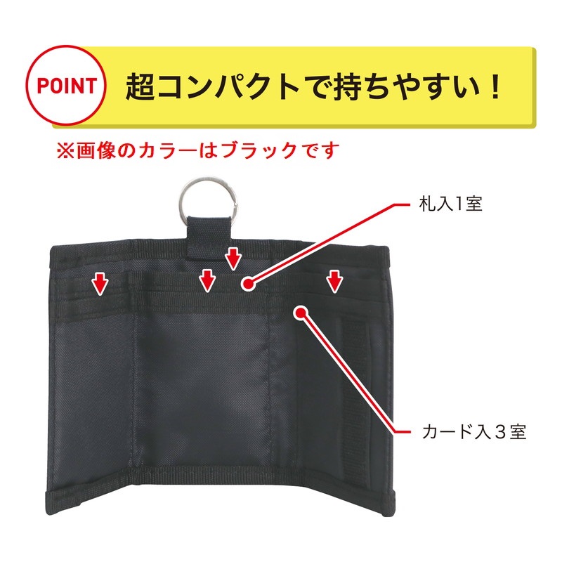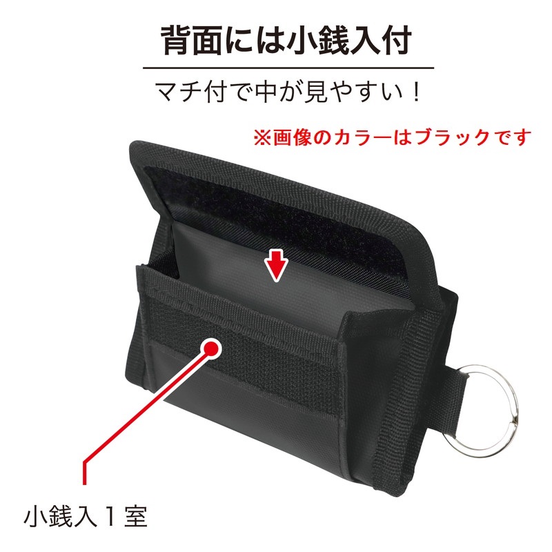 本体生地はマット調のコーティング生地を使用、札1室・小銭入れ1室・カート入れ3室仕様