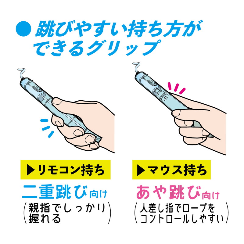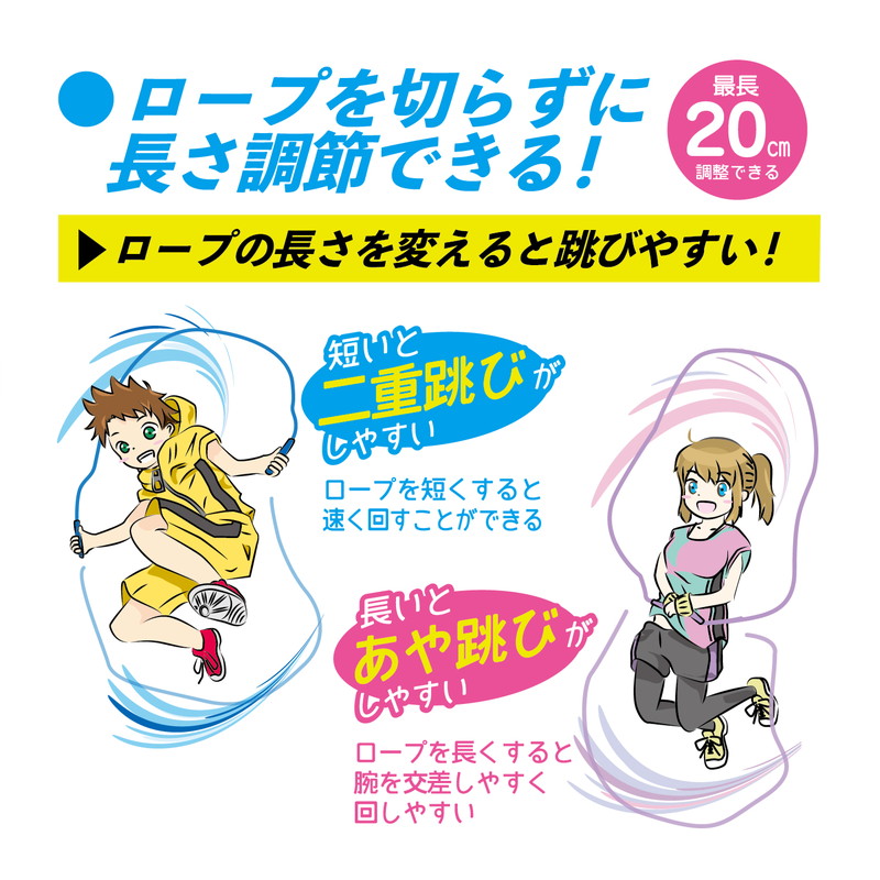 ワンタッチでロープの長さが調整可能(最大20cm調節可能)、跳びやすい持ち方が出来るグリップ採用