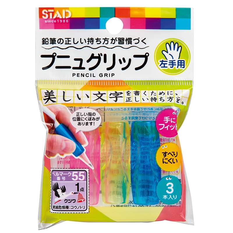 鉛筆やペンをすべりにくくもちやすくするグリップ、正しい指の位置にくぼみが有り、3本入り