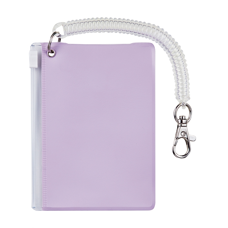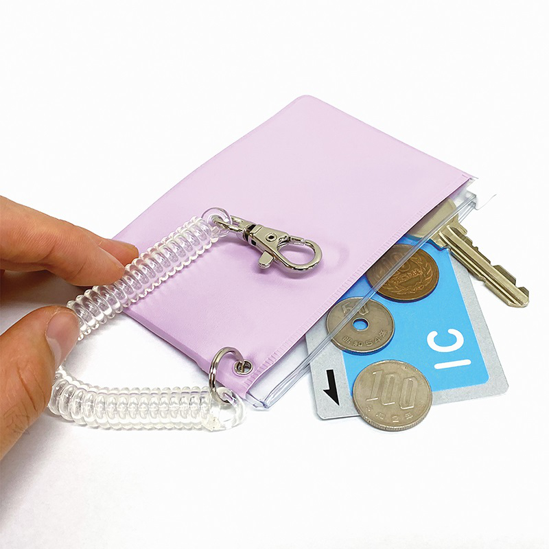 カードを落としにくいホック付きポケット、最大で80cmのびるコイルチェーン付
