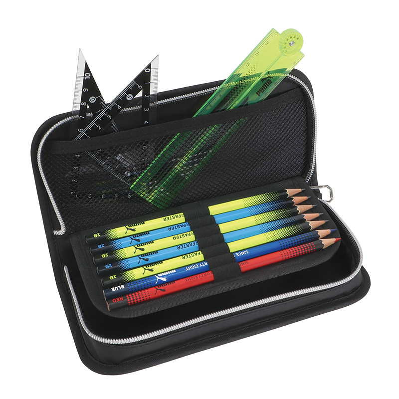 内側には黒芯鉛筆5本と赤鉛筆や青鉛筆計7本が挿せる鉛筆ホルダー付、蓋内側にメッシュポケット付