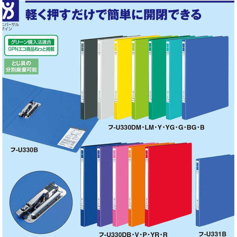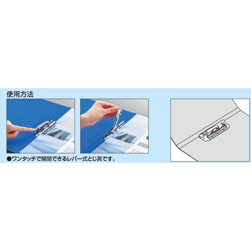 紙類にホールを作らなくても挟み込むことができるタイプで、ボタンを押すとレバーが開いて、ワンタッチで使えます。