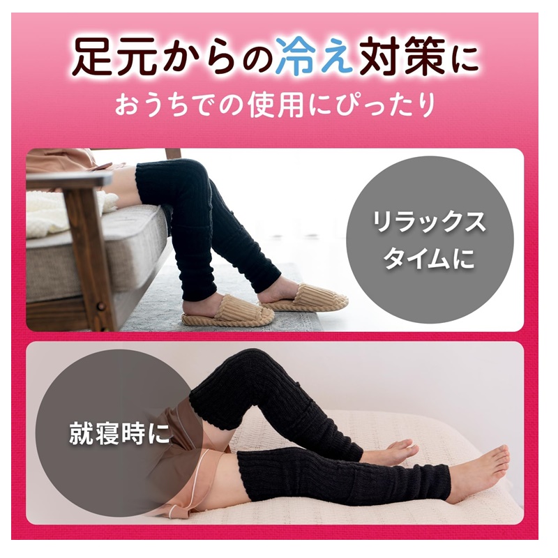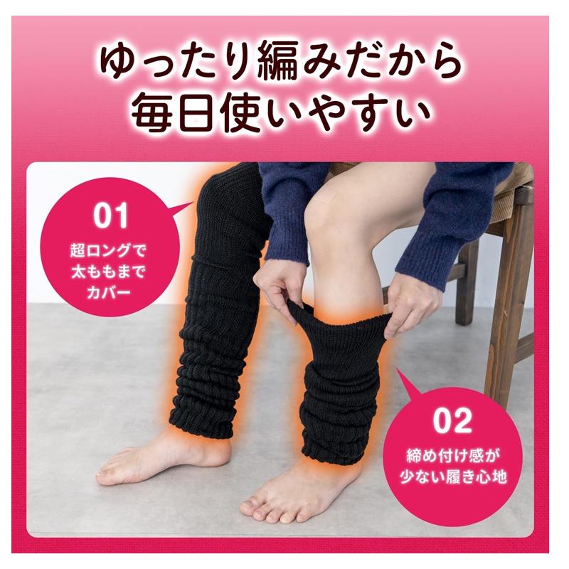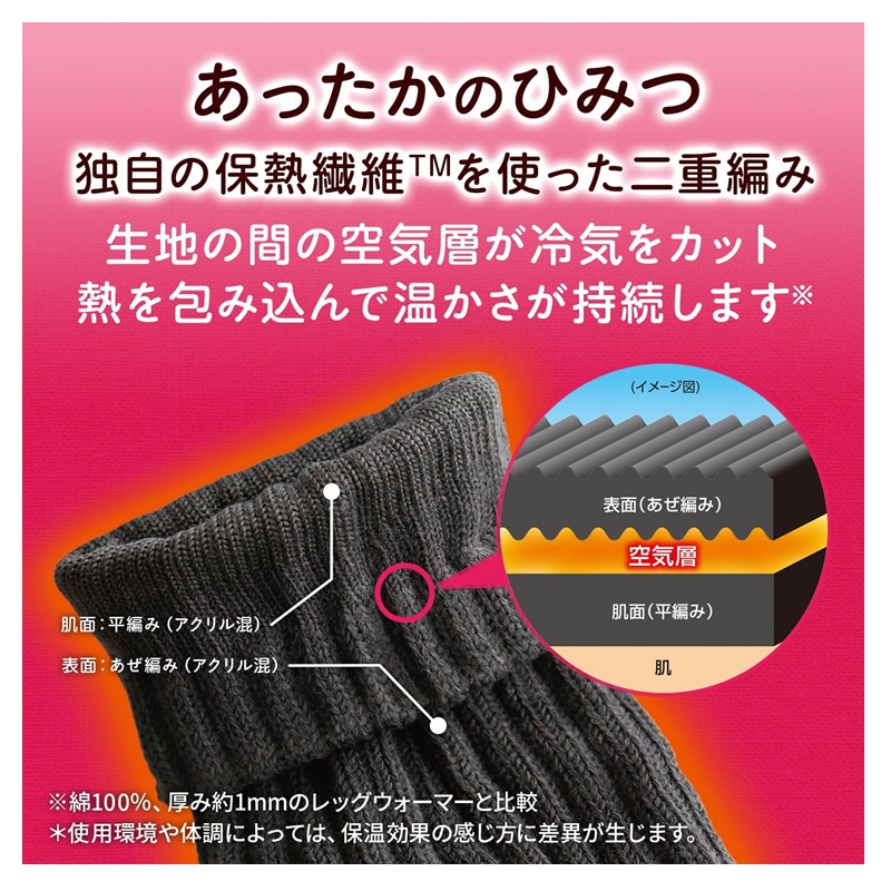 レッグウォーマー全体が二重編み構造になっていて熱を包み込みます。