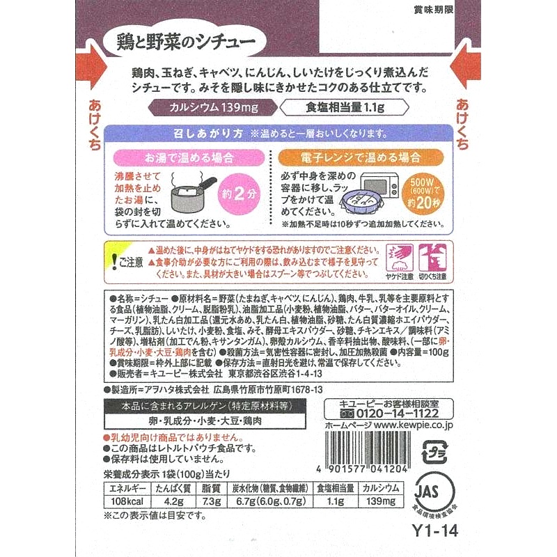 - 野菜(たまねぎ、キャベツ、にんじん)、鶏肉、牛乳、乳等を主要原料とする食品(植物油脂、クリーム、脱脂粉乳)、