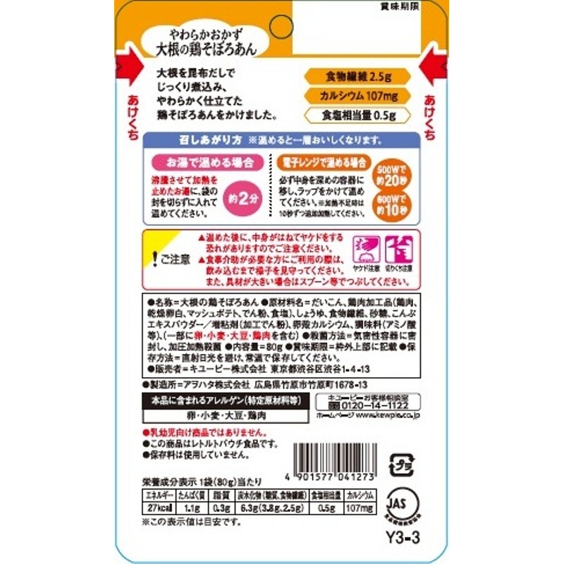 - だいこん、鶏肉加工品(鶏肉、乾燥卵白、マッシュポテト、でん粉、食塩)、しょうゆ、食物繊維、砂糖、