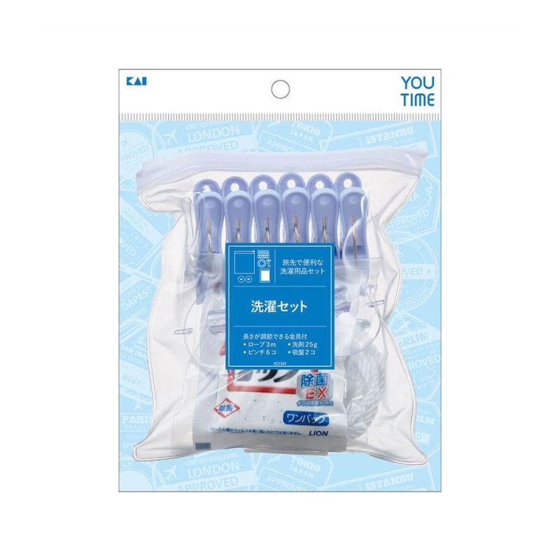 旅先で便利な洗濯用品セット。長さが調節できる金具付。
