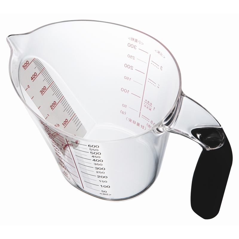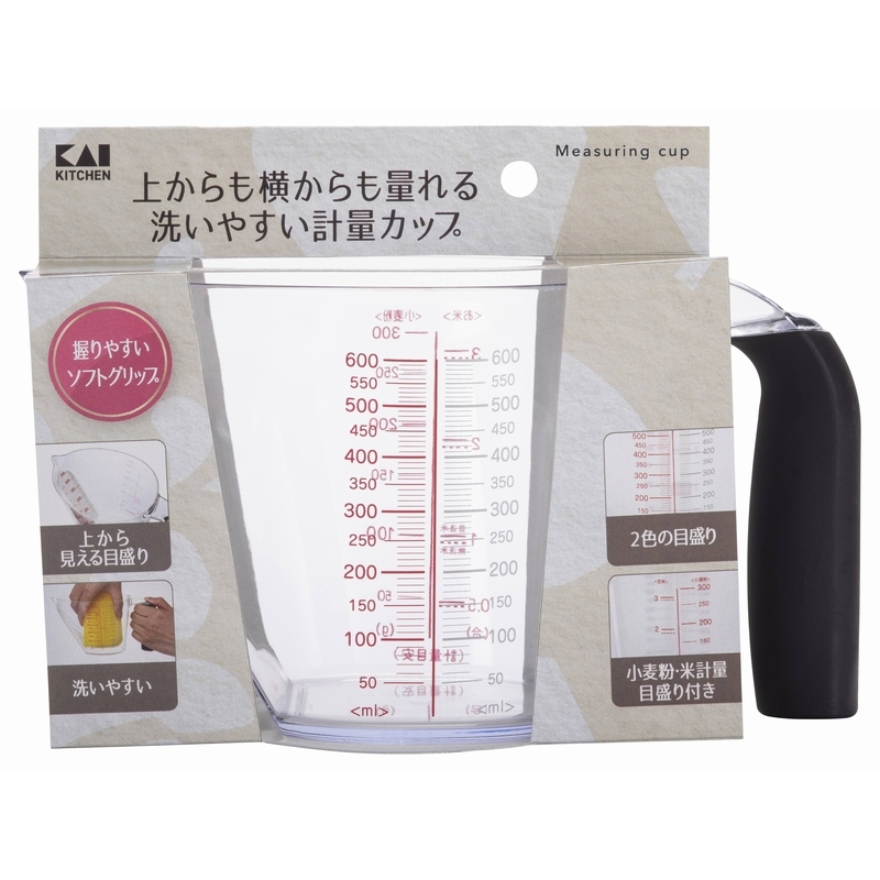上からも横からも見て量れる、握りやすいソフトグリップ付きの計量カップです。