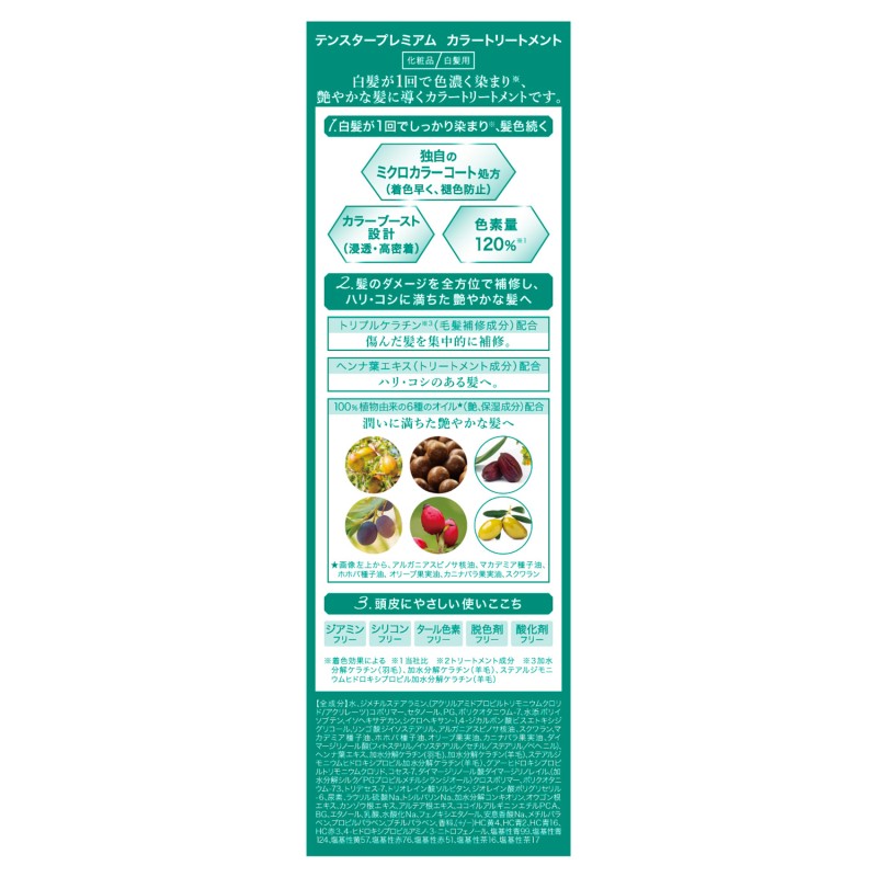 ●頭皮にやさしい使いここち。ジアミンフリー、シリコンフリー、タール色素フリー、脱色剤フリー、酸化剤フリー。