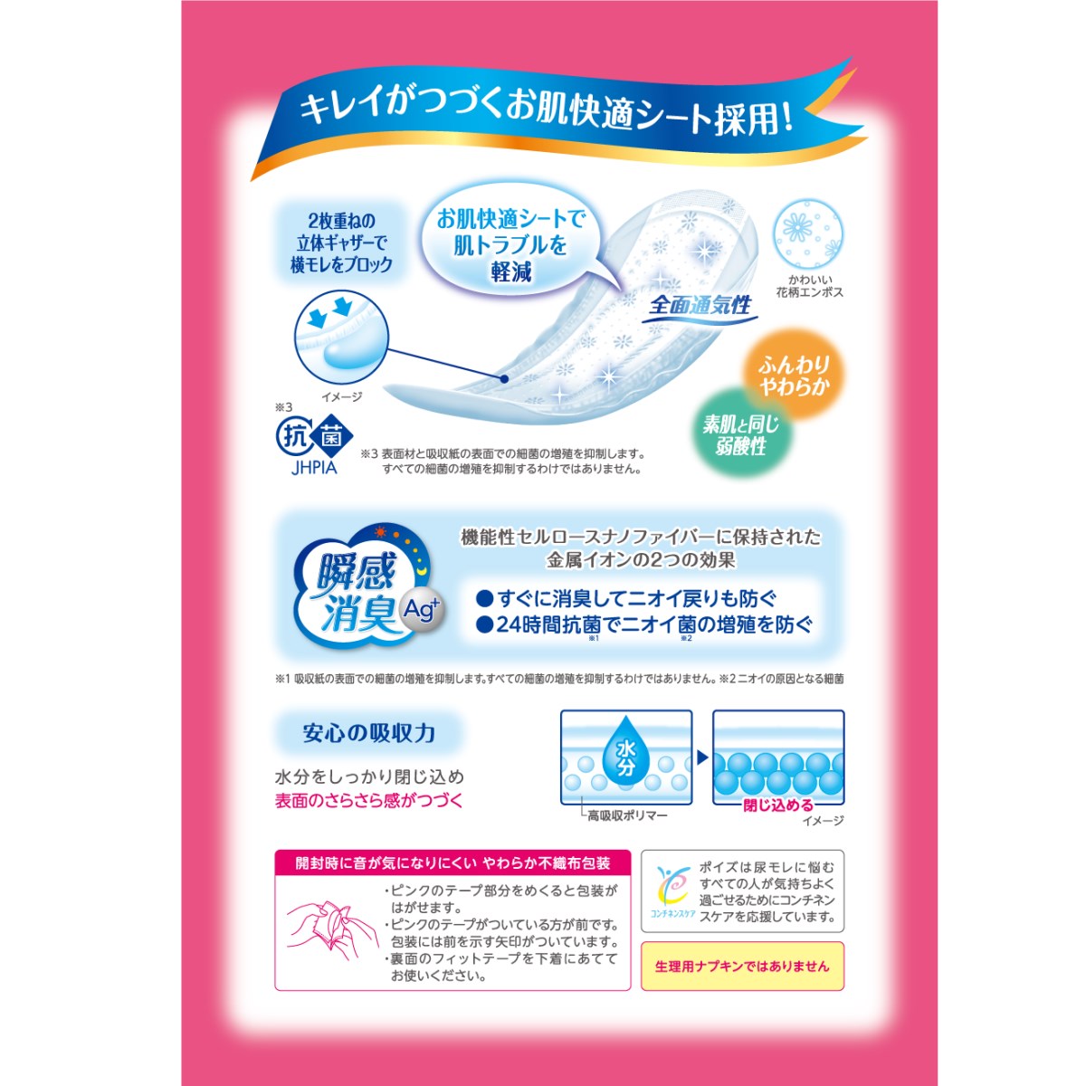 「弱酸性・全面通気性シート」に加え、ポイズパッドは、「瞬間消臭シート」を採用しているので、ニオイが発生した瞬間から継続的