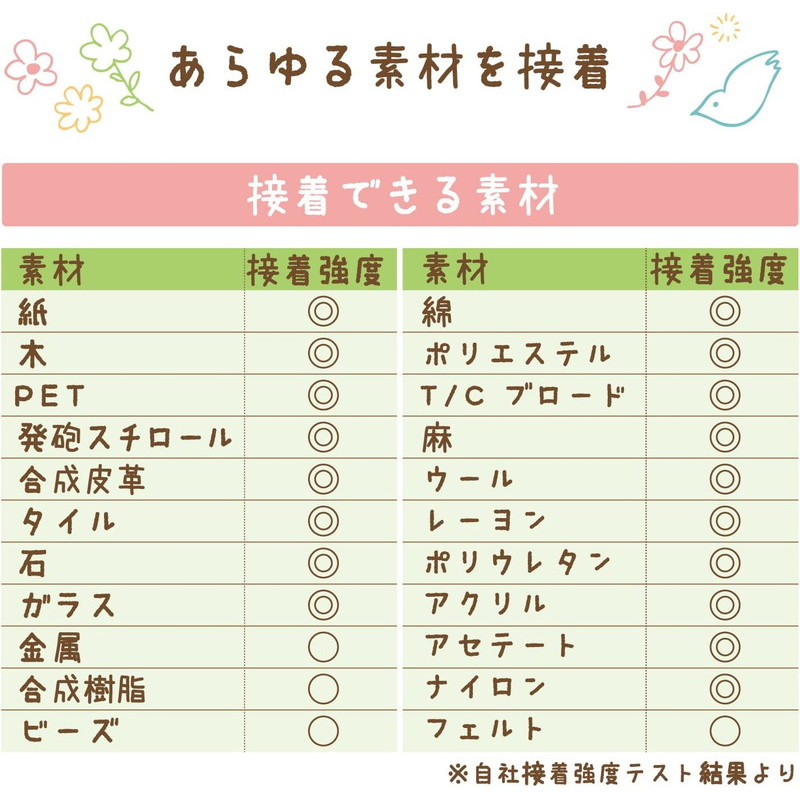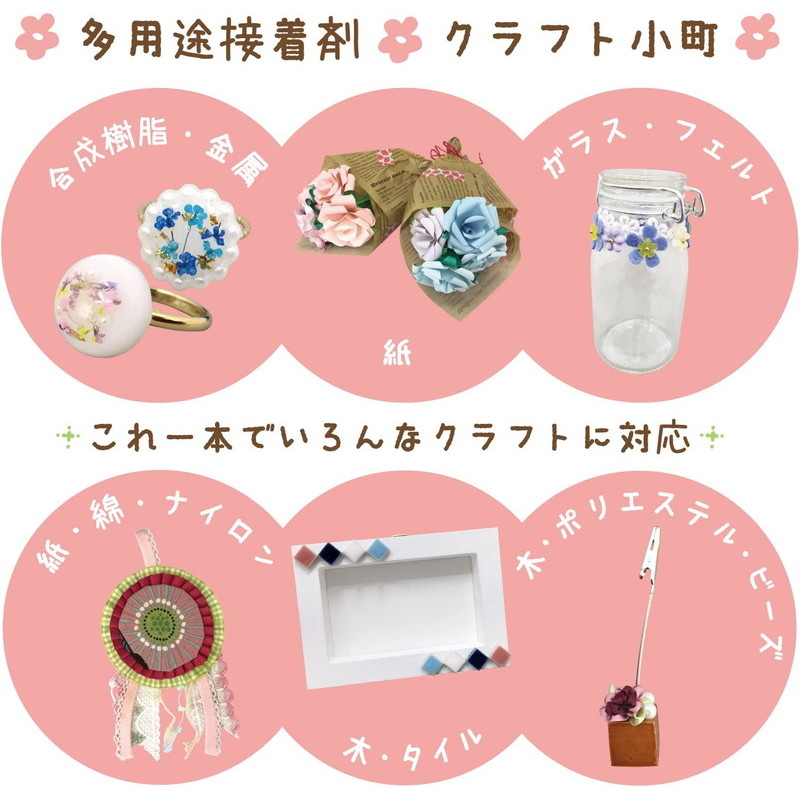 ・布、木、紙、金属、ガラス等を強力接着できるため、1本で多様なクラフトに対応できます