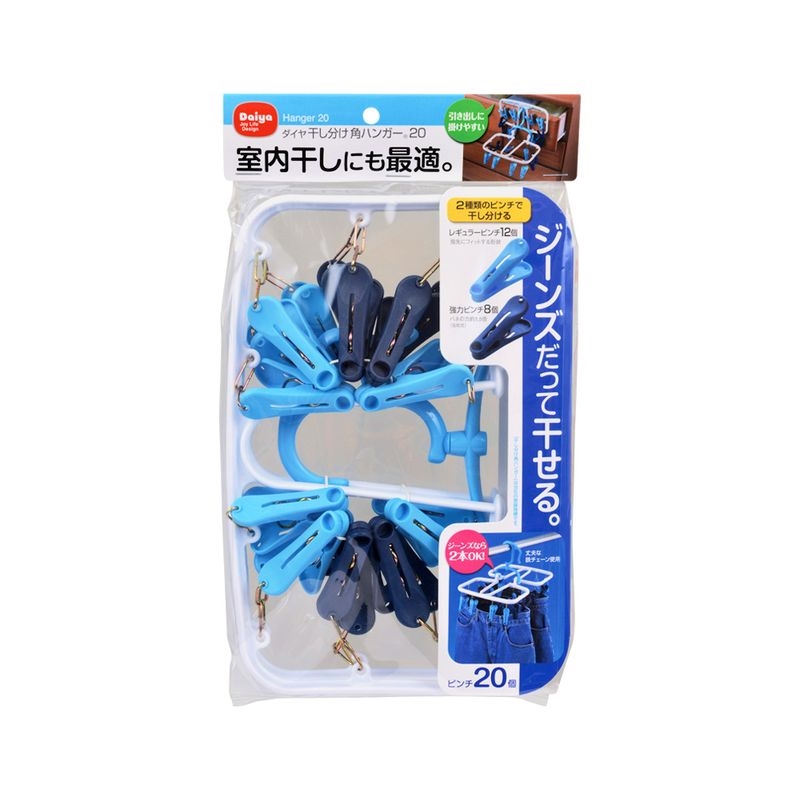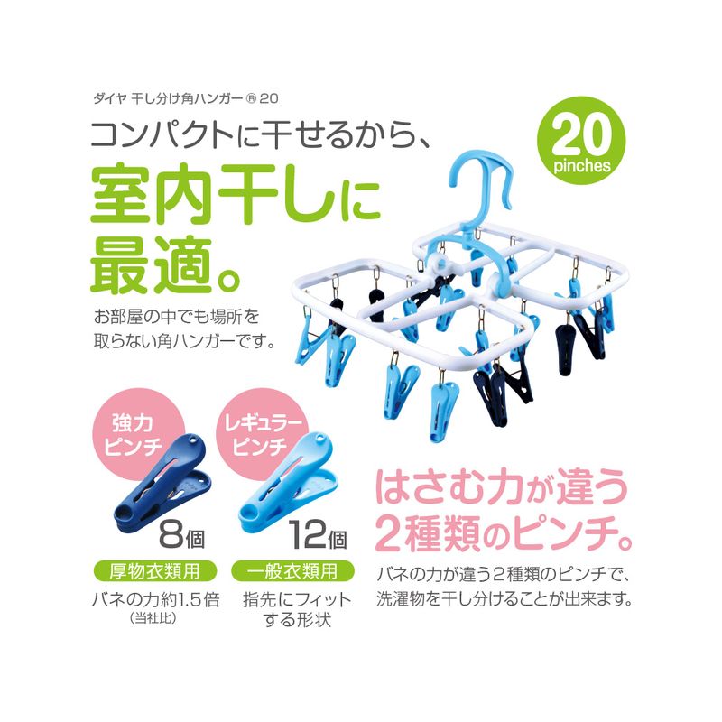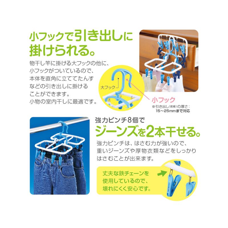 開きやすい2種類のフィットピンチを採用。強力ピンチは通常ピンチの約1.5倍のバネの強さで8個でジーンズ2本を干せます。